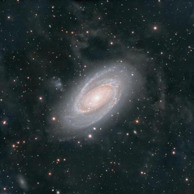 Bode's Galaxy (Messier 81) is a grand design spiral galaxy about 12 million light-years away in the constellation Ursa Major. Discovered by Johann Elert Bode in 1774, it is one of the brightest galaxies in the night sky and a popular target for amateur astronomers due to its large size and well-defined spiral arms.